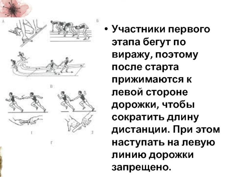 Слайд 6Участники первого этапа бегут по виражу, поэтому после старта прижимаются к