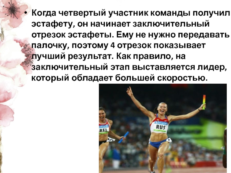 Ему не нужно передавать палочку, поэтому 4 отрезок показывает лучший результат. Как правило, на заключительный этап выставляется лидер, который обладает большей скоростью.