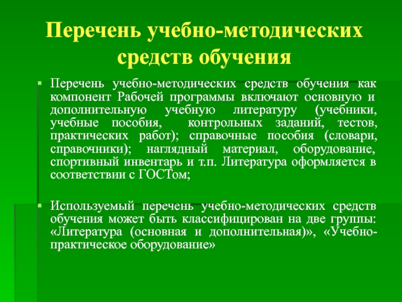 Используемый перечень учебно-методических средств обучения может быть классифицирован на две группы: «Литература (основная и дополнительная)», «Учебно-практическое оборудование»