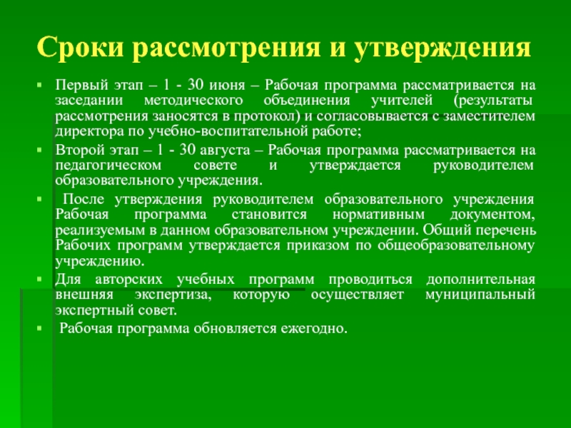 Второй этап – 1 - 30 августа – Рабочая программа рассматривается на педагогическом совете и утверждается руководителем образовательного учреждения.