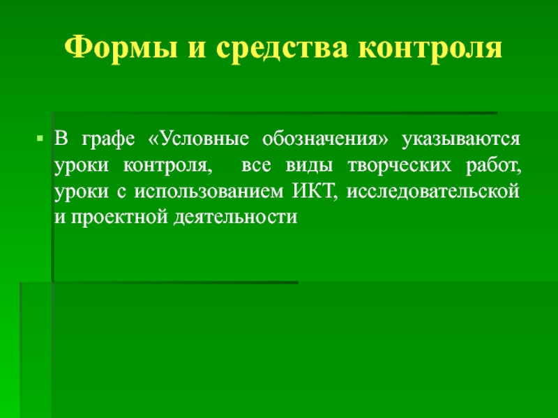 В графе «Условные обозначения» указываются уроки контроля, все