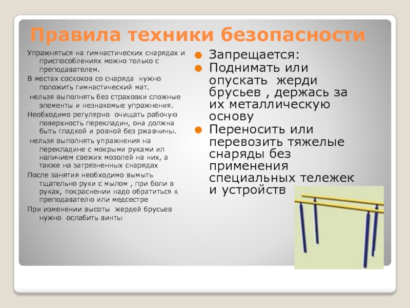 Поднимать или опускать жерди брусьев , держась за их металлическую основу