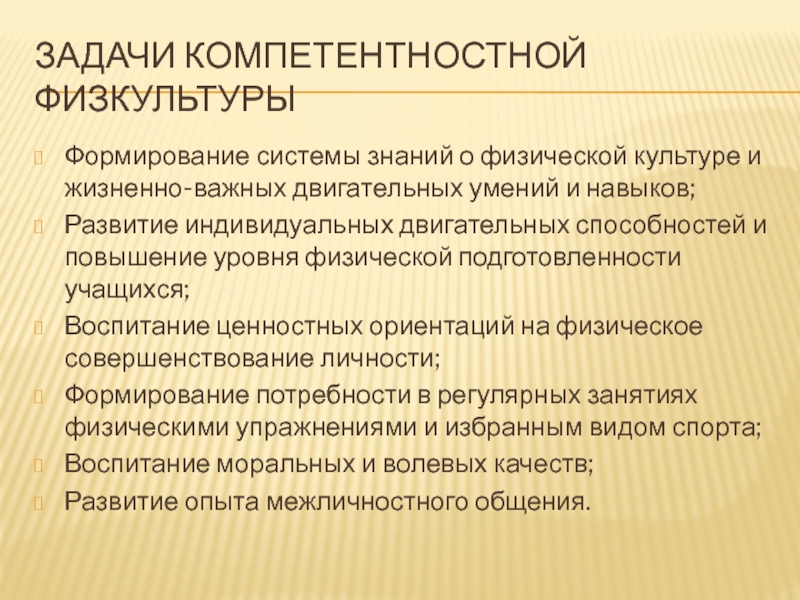 Воспитание ценностных ориентаций на физическое совершенствование личности;