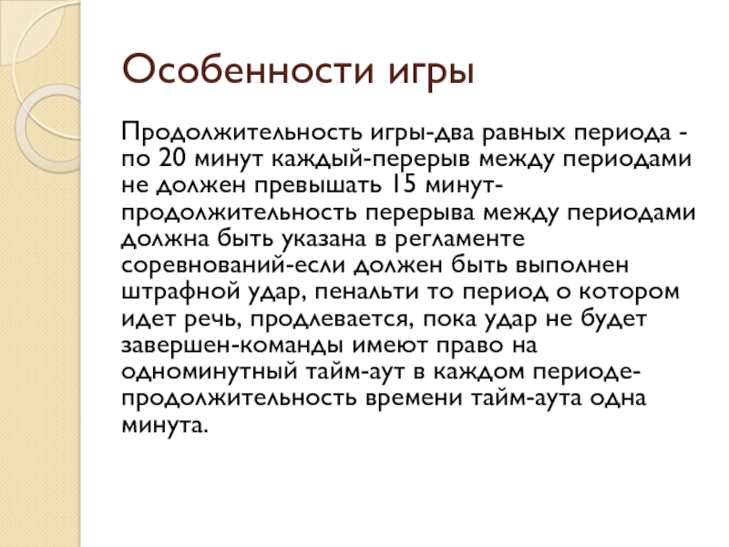 периодами не должен превышать 15 минут-продолжительность перерыва между периодами должна быть указана в регламенте соревнований-если должен быть выполнен штрафной удар, пенальти то период о котором идет речь, продлевается, пока удар не будет завершен-команды имеют право на одноминутный тайм-аут в каждом периоде-продолжительность времени тайм-аута одна минута.