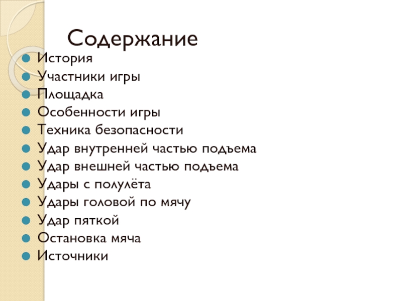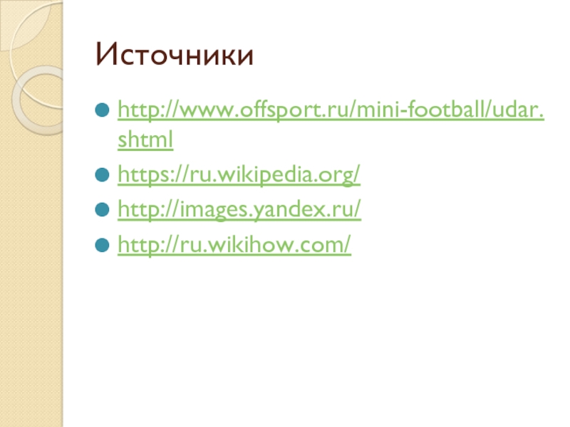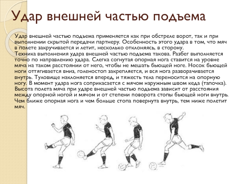 ворот, так и при выполнении скрытой передачи партнеру. Особенность этого удара в том, что мяч в полете закручивается и летит, несколько отклоняясь, в сторону.