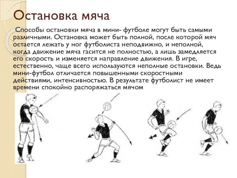 различными. Остановка может быть полной, после которой мяч остается лежать у ног футболиста неподвижно, и неполной, когда движение мяча гасится не полностью, а лишь замедляется его скорость и изменяется направление движения. В игре, естественно, чаще всего используются неполные остановки. Ведь мини-футбол отличается повышенными скоростными действиями, интенсивностью. В результате футболист не имеет времени спокойно распоряжаться мячом