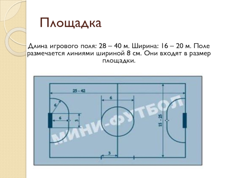 Длина игрового поля: 28 – 40 м. Ширина: 16 – 20