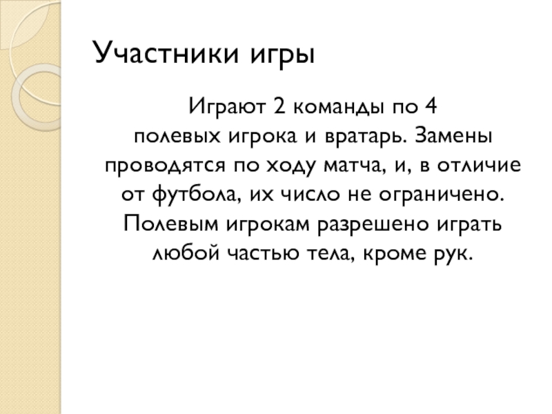матча, и, в отличие от футбола, их число не ограничено. Полевым игрокам разрешено играть любой частью тела, кроме рук.