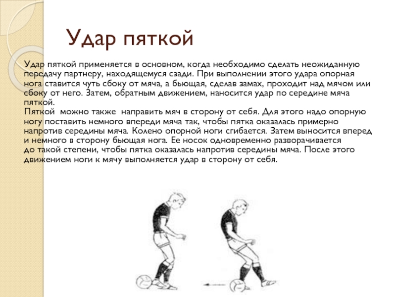 партнеру, находящемуся сзади. При выполнении этого удара опорная нога ставится чуть сбоку от мяча, а бьющая, сделав замах, проходит над мячом или сбоку от него. Затем, обратным движением, наносится удар по середине мяча пяткой.