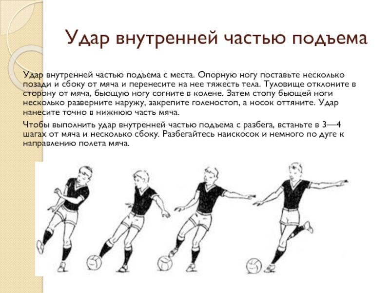 Чтобы выполнить удар внутренней частью подъема с разбега, встаньте в 3—4 шагах от мяча и несколько сбоку. Разбегайтесь наискосок и немного по дуге к направлению полета мяча.