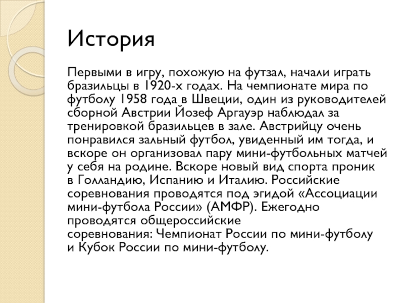 годах. На чемпионате мира по футболу 1958 года в Швеции, один из руководителей сборной Австрии Йозеф Аргауэр наблюдал за тренировкой бразильцев в зале. Австрийцу очень понравился зальный футбол, увиденный им тогда, и вскоре он организовал пару мини-футбольных матчей у себя на родине. Вскоре новый вид спорта проник в Голландию, Испанию и Италию. Российские соревнования проводятся под эгидой «Ассоциации мини-футбола России» (АМФР). Ежегодно проводятся общероссийские соревнования: Чемпионат России по мини-футболу и Кубок России по мини-футболу.