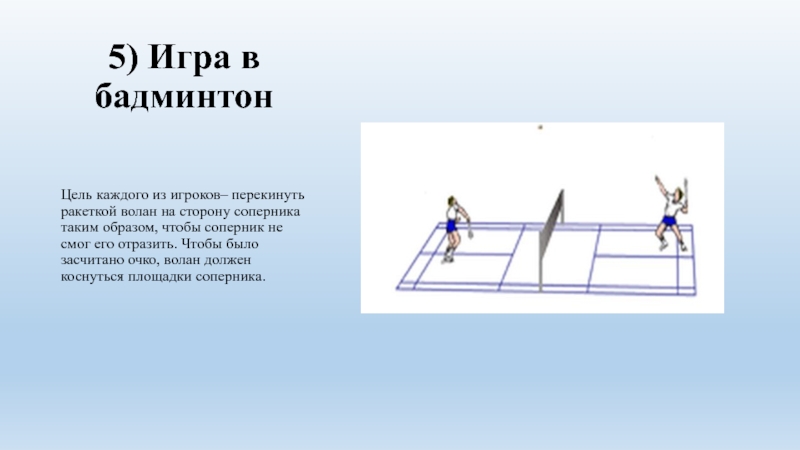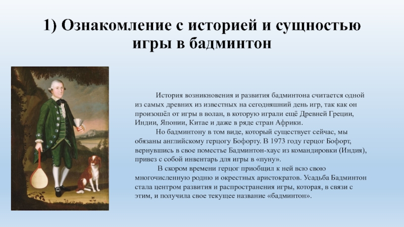 Слайд 21) Ознакомление с историей и сущностью игры в бадминтон