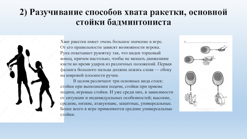 2) Разучивание способов хвата ракетки, основной стойки бадминтониста;