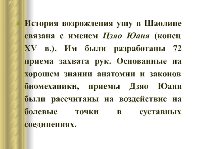 XV в.). Им были разработаны 72 приема захвата рук. Основанные на хорошем знании анатомии и законов биомеханики, приемы Дзяо Юаня были рассчитаны на воздействие на болевые точки в суставных соединениях.