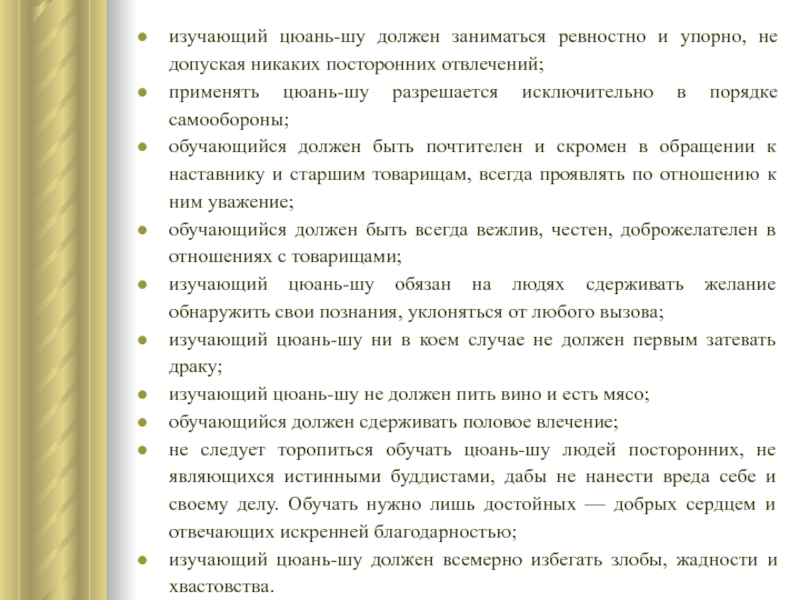 не следует торопиться обучать цюань-шу людей посторонних, не являющихся истинными буддистами, дабы не нанести вреда себе и своему делу. Обучать нужно лишь достойных — добрых сердцем и отвечающих искренней благодарностью;