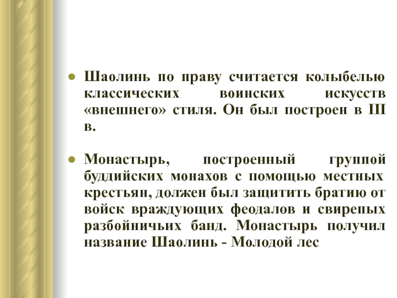 Монастырь, построенный группой буддийских монахов с помощью местных крестьян, должен был защитить братию от войск враждующих феодалов и свирепых разбойничьих банд. Монастырь получил название Шаолинь - Молодой лес