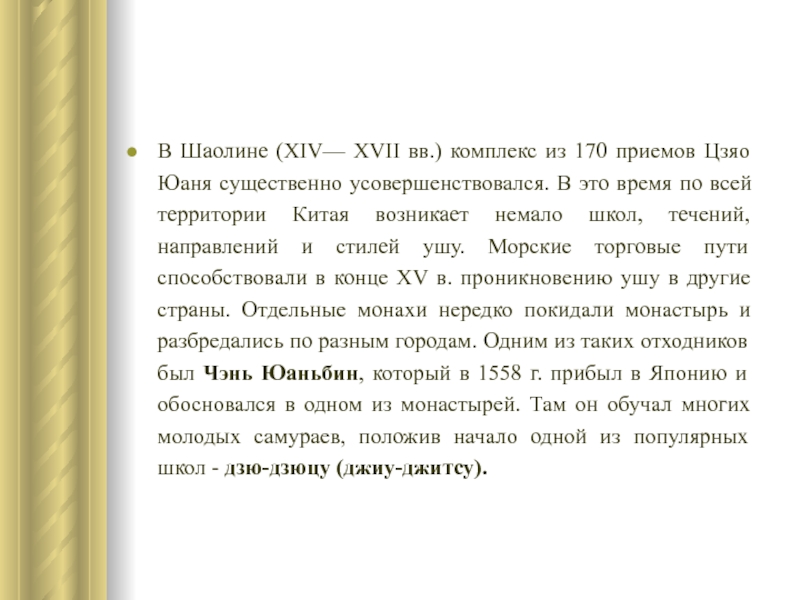 существенно усовершенствовался. В это время по всей территории Китая возникает немало школ, течений, направлений и стилей ушу. Морские торговые пути способствовали в конце XV в. проникновению ушу в другие страны. Отдельные монахи нередко покидали монастырь и разбредались по разным городам. Одним из таких отходников был Чэнь Юаньбин, который в 1558 г. прибыл в Японию и обосновался в одном из монастырей. Там он обучал многих молодых самураев, положив начало одной из популярных школ - дзю-дзюцу (джиу-джитсу).