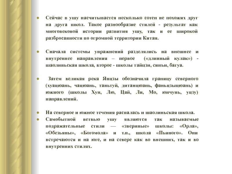 школ. Такое разнообразие стилей - результат как многовековой истории развития ушу, так и ее широкой разбросанности по огромной территории Китая.