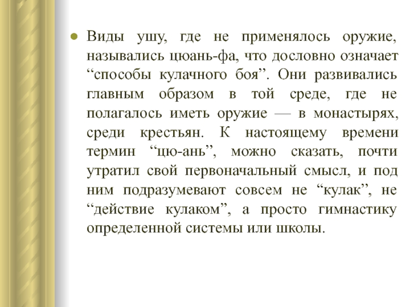 Виды ушу, где не применялось оружие, назывались цюань-фа, что дословно означает