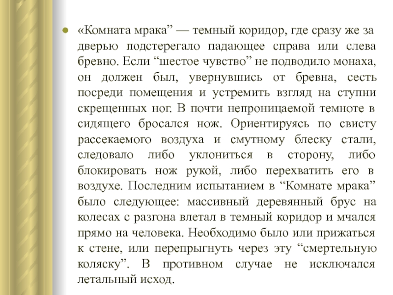 падающее справа или слева бревно. Если “шестое чувство” не подводило монаха, он должен был, увернувшись от бревна, сесть посреди помещения и устремить взгляд на ступни скрещенных ног. В почти непроницаемой темноте в сидящего бросался нож. Ориентируясь по свисту рассекаемого воздуха и смутному блеску стали, следовало либо уклониться в сторону, либо блокировать нож рукой, либо перехватить его в воздухе. Последним испытанием в “Комнате мрака” было следующее: массивный деревянный брус на колесах с разгона влетал в темный коридор и мчался прямо на человека. Необходимо было или прижаться к стене, или перепрыгнуть через эту “смертельную коляску”. В противном случае не исключался летальный исход.