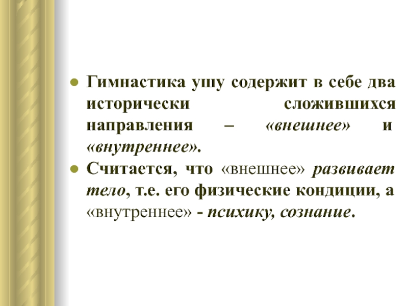 Считается, что «внешнее» развивает тело, т.е. его физические кондиции, а «внутреннее» - психику, сознание.
