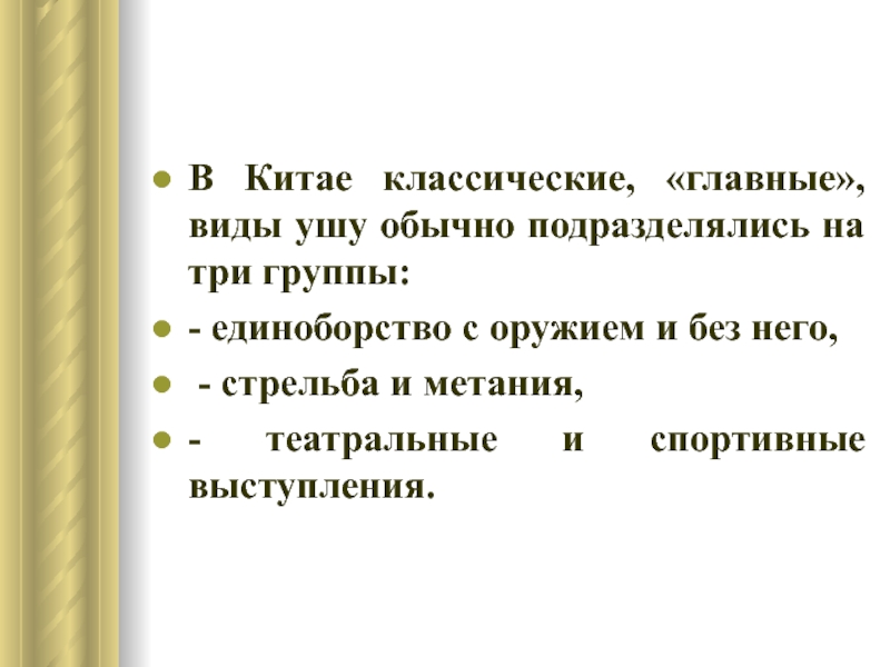 В Китае классические, «главные», виды ушу обычно подразделялись на три группы: