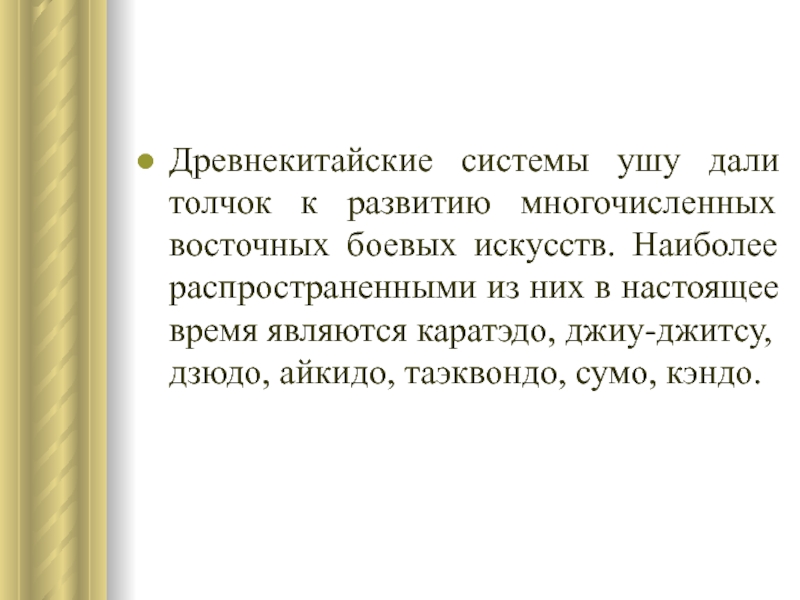 Древнекитайские системы ушу дали толчок к развитию многочисленных восточных боевых искусств.