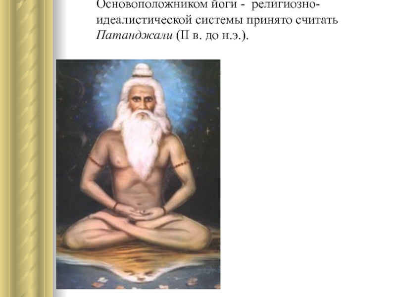 Слайд 6Основоположником йоги - религиозно-идеалистической системы принято считать Патанджали (II в. до