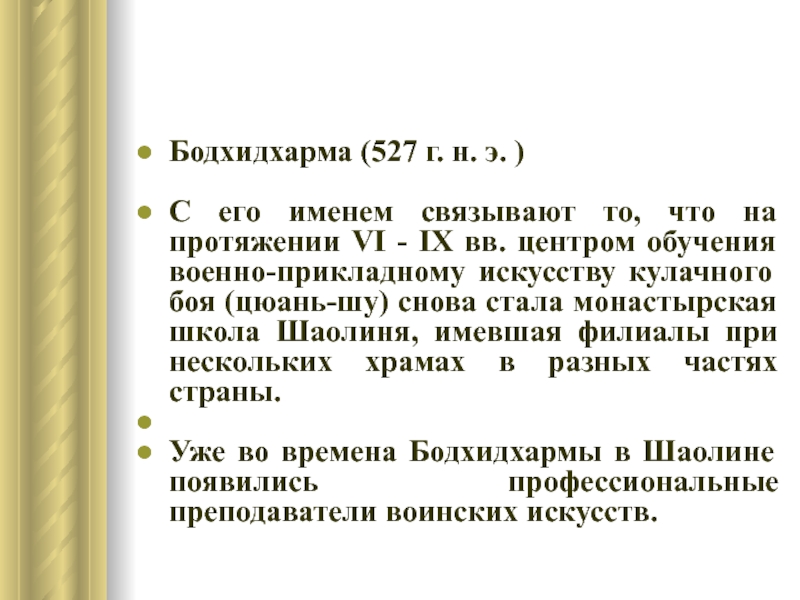 Уже во времена Бодхидхармы в Шаолине появились профессиональные преподаватели воинских искусств.
