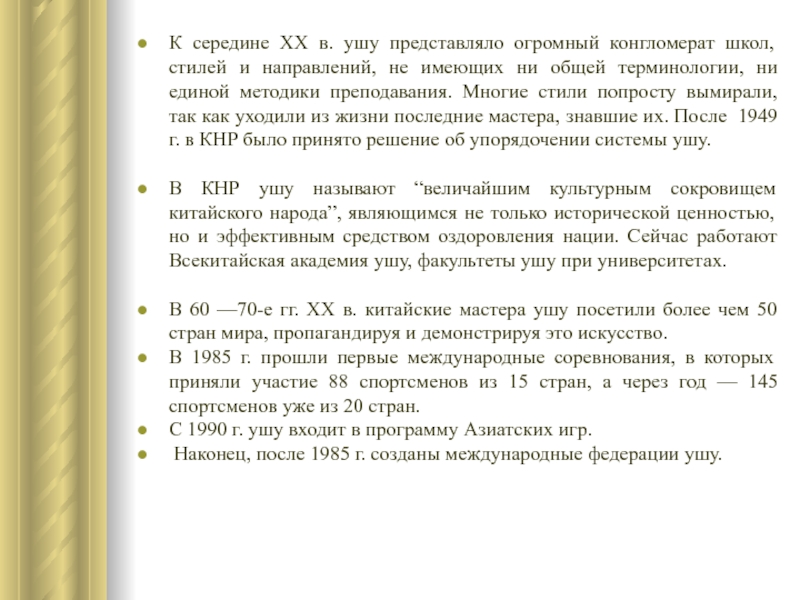 направлений, не имеющих ни общей терминологии, ни единой методики преподавания. Многие стили попросту вымирали, так как уходили из жизни последние мастера, знавшие их. После 1949 г. в КНР было принято решение об упорядочении системы ушу.