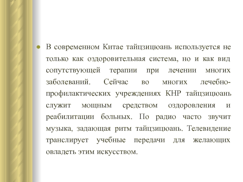 и как вид сопутствующей терапии при лечении многих заболеваний. Сейчас во многих лечебно-профилактических учреждениях КНР тайцзицюань служит мощным средством оздоровления и реабилитации больных. По радио часто звучит музыка, задающая ритм тайцзицюань. Телевидение транслирует учебные передачи для желающих овладеть этим искусством.