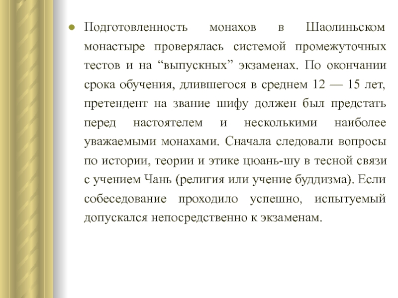 “выпускных” экзаменах. По окончании срока обучения, длившегося в среднем 12 — 15 лет, претендент на звание шифу должен был предстать перед настоятелем и несколькими наиболее уважаемыми монахами. Сначала следовали вопросы по истории, теории и этике цюань-шу в тесной связи с учением Чань (религия или учение буддизма). Если собеседование проходило успешно, испытуемый допускался непосредственно к экзаменам.