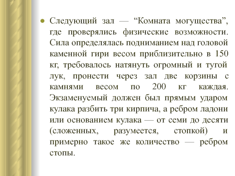 подниманием над головой каменной гири весом приблизительно в 150 кг, требовалось натянуть огромный и тугой лук, пронести через зал две корзины с камнями весом по 200 кг каждая. Экзаменуемый должен был прямым ударом кулака разбить три кирпича, а ребром ладони или основанием кулака — от семи до десяти (сложенных, разумеется, стопкой) и примерно такое же количество — ребром стопы.