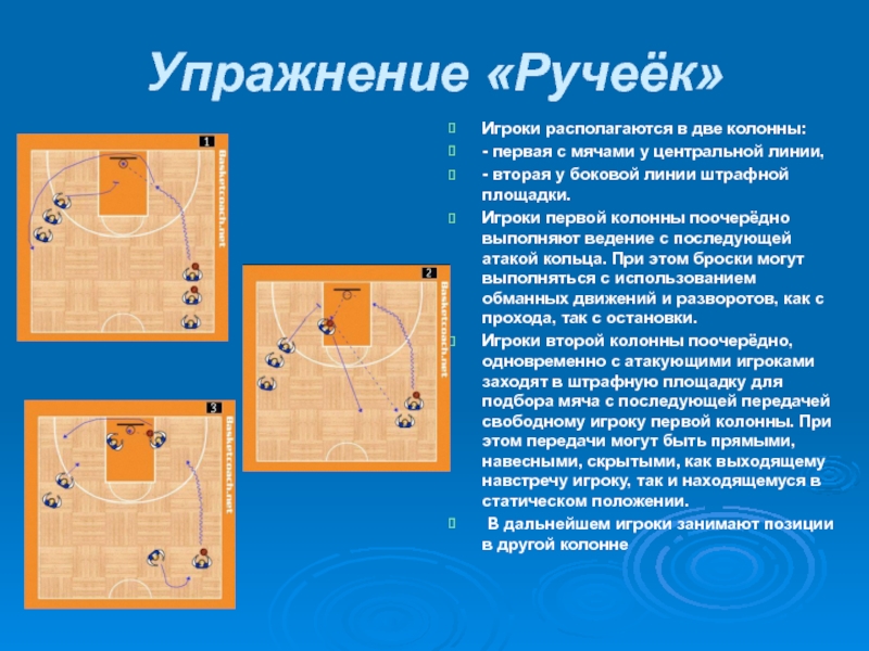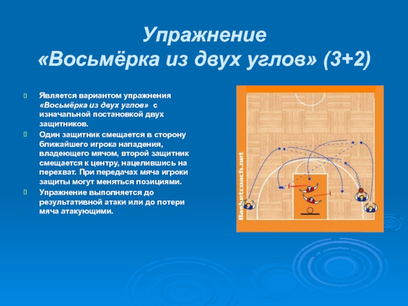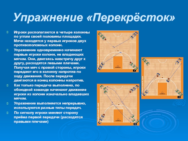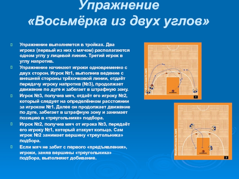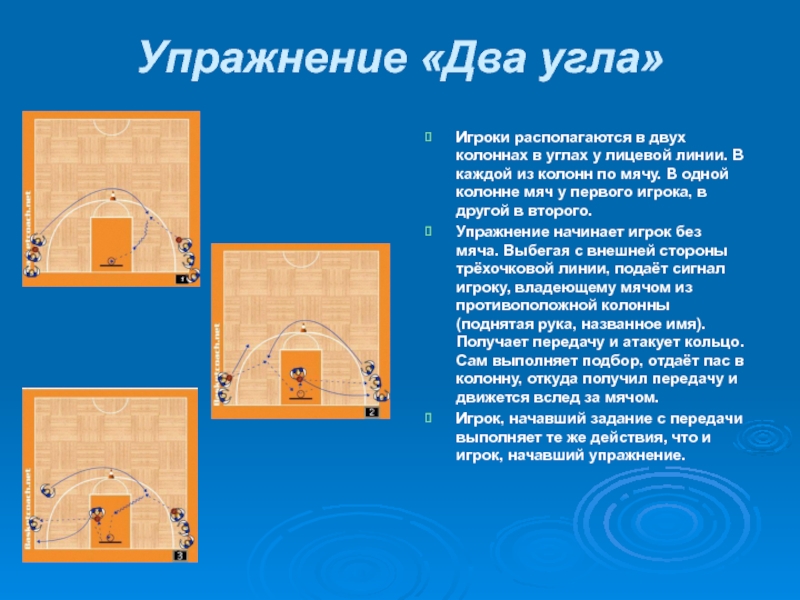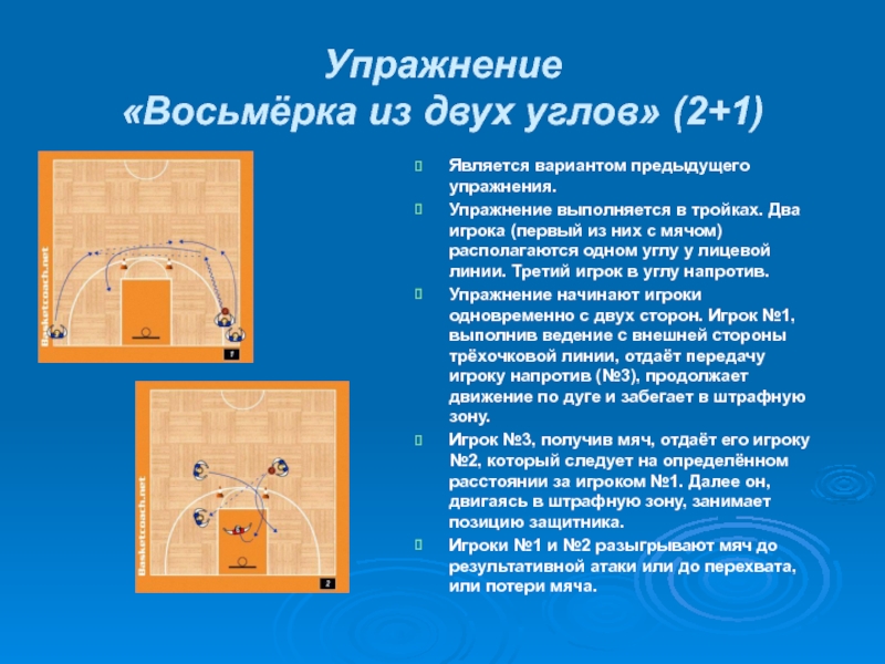 Упражнение начинают игроки одновременно с двух сторон. Игрок №1, выполнив ведение с внешней стороны трёхочковой линии, отдаёт передачу игроку напротив (№3), продолжает движение по дуге и забегает в штрафную зону.