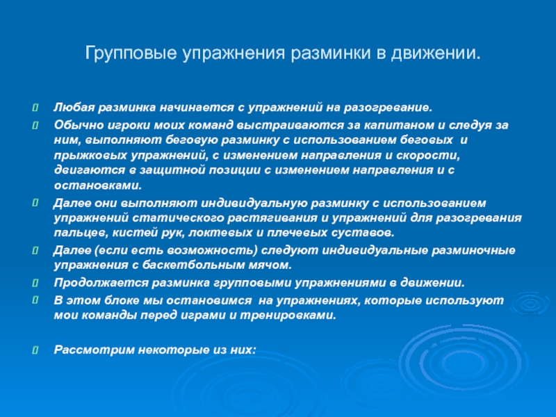 В этом блоке мы остановимся на упражнениях, которые используют мои команды перед играми и тренировками.