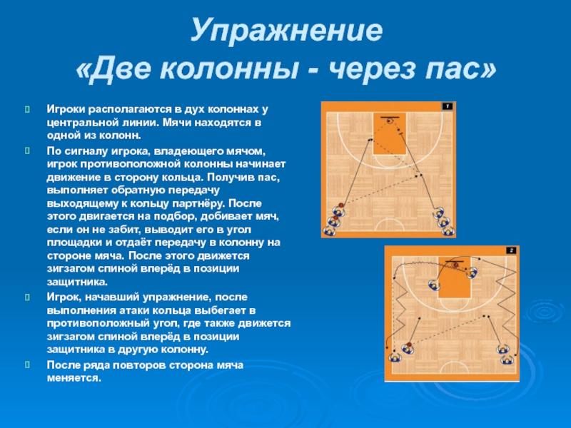 Упражнение начинает игрок без мяча. Выбегая с внешней стороны трёхочковой линии, подаёт сигнал игроку, владеющему мячом из противоположной колонны (поднятая рука, названное имя). Получает передачу и атакует кольцо. Сам выполняет подбор, отдаёт пас в колонну, откуда получил передачу и движется вслед за мячом.