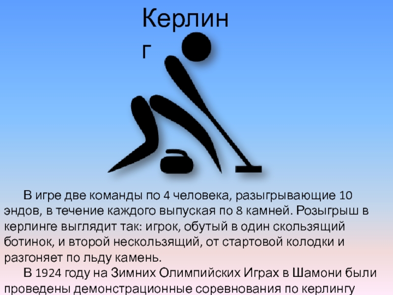 течение каждого выпуская по 8 камней. Розыгрыш в керлинге выглядит так: игрок, обутый в один скользящий ботинок, и второй нескользящий, от стартовой колодки и разгоняет по льду камень.