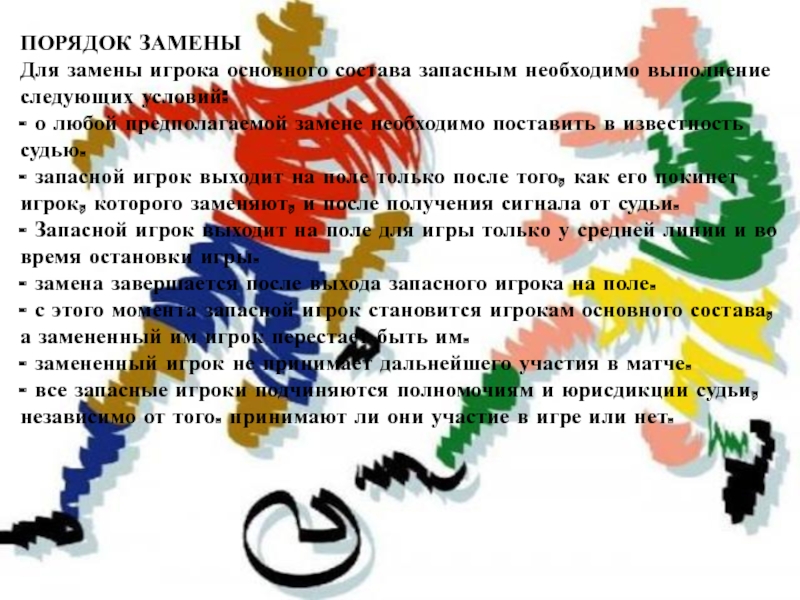 - с этого момента запасной игрок становится игрокам основного состава, а замененный им игрок перестает быть им.