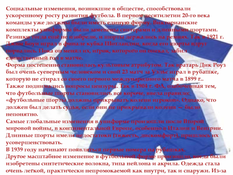 Слайд 25Футбольная униформа значительно менялась на протяжении всей истории футбола. Это сегодня