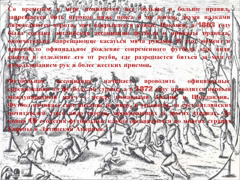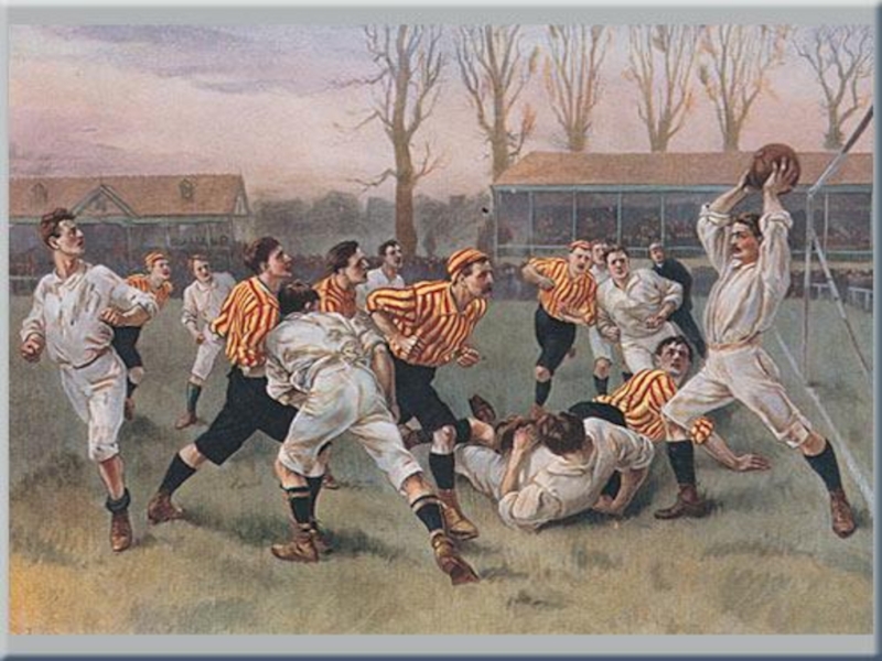 бить игроков ниже пояса и по ногам, двумя палками определяются ворота, мяч покрывается кожей. Наконец, в 1863 году была создана английская ассоциация футбола и приняты правила, окончательно запрещающие касаться мяча руками. В этот момент и произошло официальное рождение современного футбола как вида спорта и отделение его от регби, где разрешается биться за мяч с использованием рук и более жестких приемов.