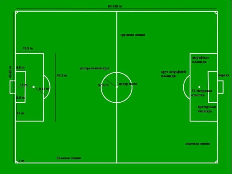 половин поля следующим образом. Из точек на расстоянии 5,5м (6 ярдов) от внутренней стороны каждой стоики ворот под прямым углом к линии ворот вглубь поля проводятся две линии. На расстоянии 5,5м (6 ярдов) эти линии соединяются другой линией параллельной линии ворот. Зона ограничиваемая этими линиями и линией ворот называется площадью ворот.