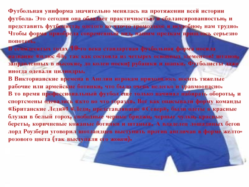 она обладает практичностью и сбалансированностью, и представить футболиста, одетого во что-то громоздкое и неудобное, нам трудно. Чтобы форма приобрела современный вид, нашим предкам пришлось серьезно попотеть.