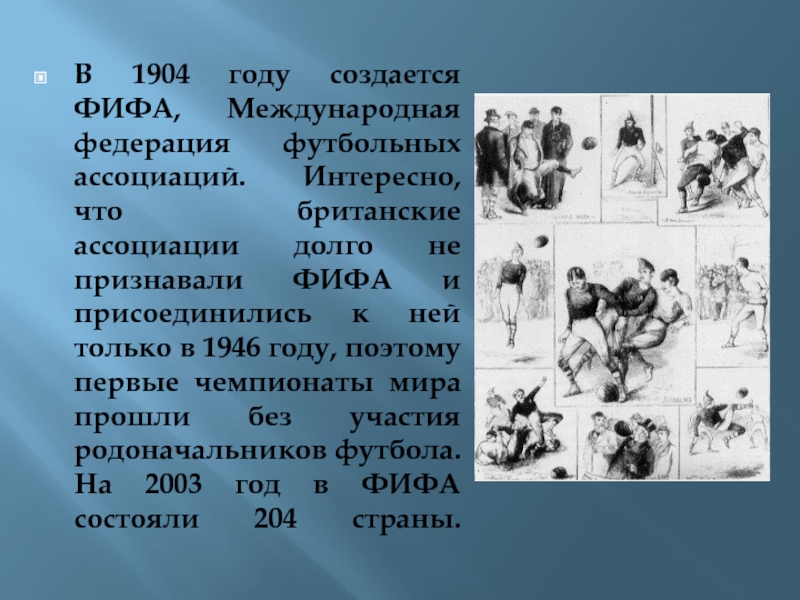 британские ассоциации долго не признавали ФИФА и присоединились к ней только в 1946 году, поэтому первые чемпионаты мира прошли без участия родоначальников футбола. На 2003 год в ФИФА состояли 204 страны.