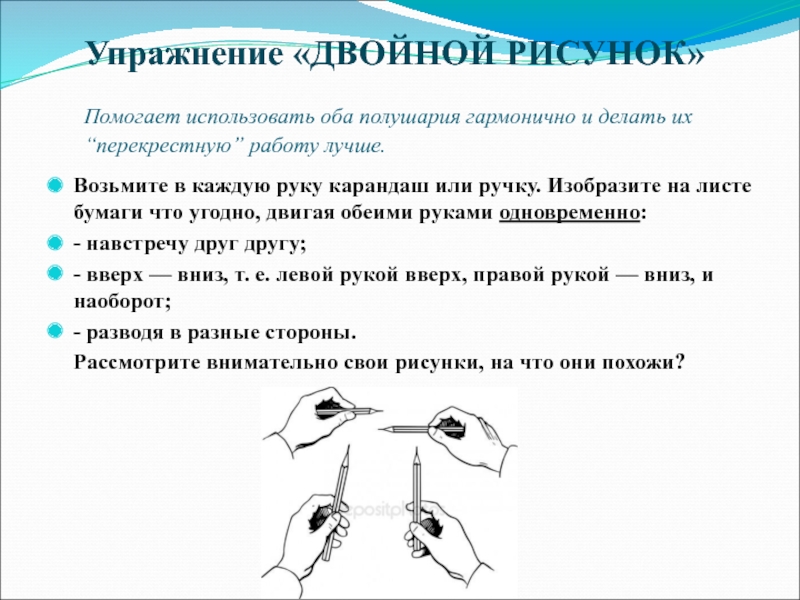Возьмите в каждую руку карандаш или ручку. Изобразите на листе бумаги что угодно, двигая обеими руками одновременно: