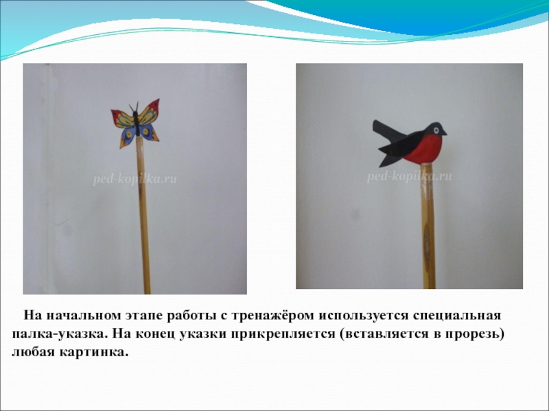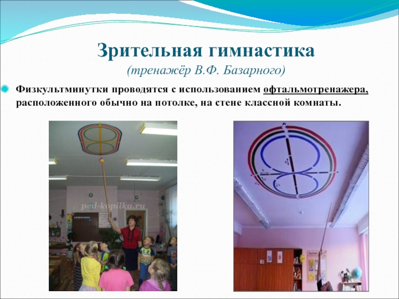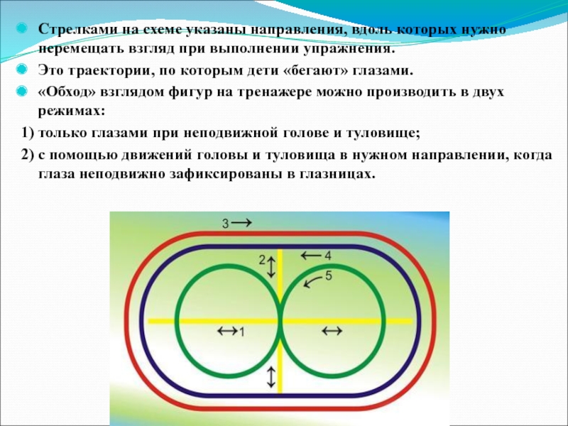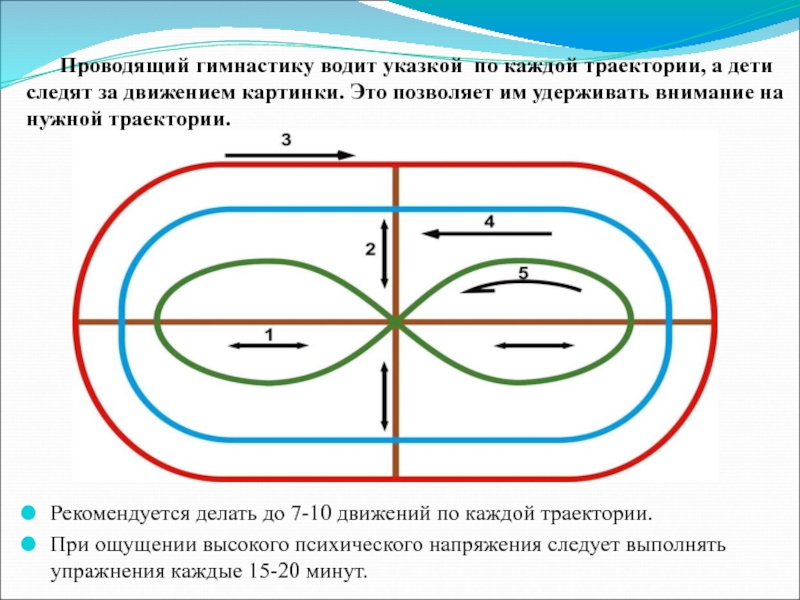 Проводящий гимнастику водит указкой по каждой траектории, а дети следят за движением картинки. Это позволяет им удерживать внимание на нужной траектории.