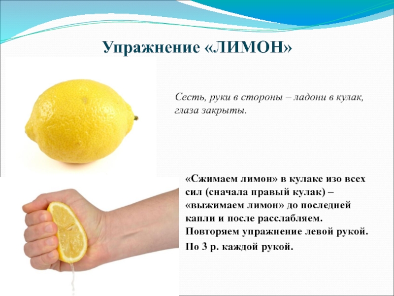 «Сжимаем лимон» в кулаке изо всех сил (сначала правый кулак) – «выжимаем лимон» до последней капли и после расслабляем. Повторяем упражнение левой рукой.