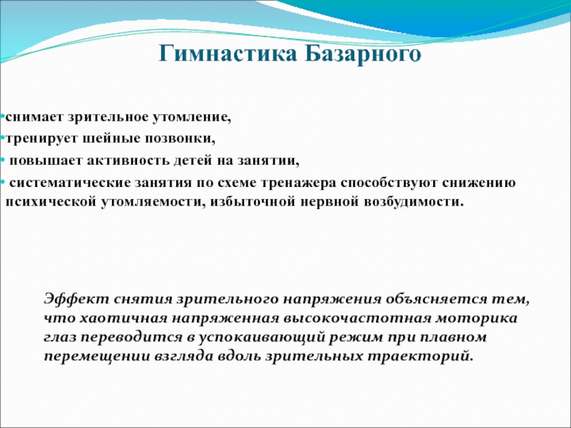 Эффект снятия зрительного напряжения объясняется тем, что хаотичная напряженная высокочастотная моторика глаз переводится в успокаивающий режим при плавном перемещении взгляда вдоль зрительных траекторий.