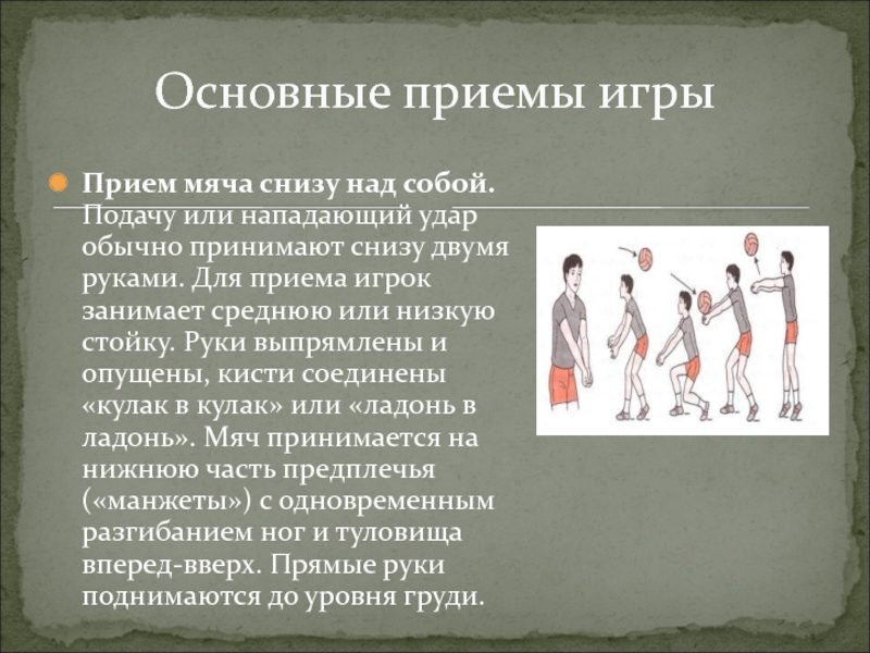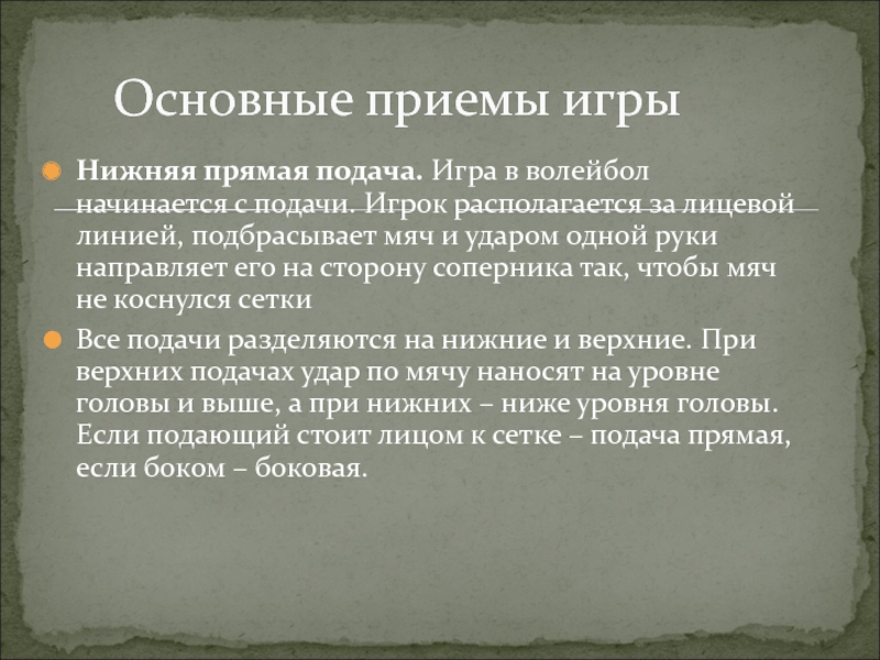 Основные приемы игрыСамой простой подачей для начинающих волейболистов является нижняя прямая. Игрок стоит лицом к сетке, ноги