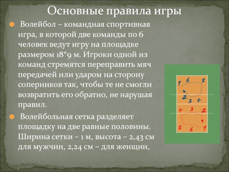 команды по 6 человек ведут игру на площадке размером 18*9 м. Игроки одной из команд стремятся переправить мяч передачей или ударом на сторону соперников так, чтобы те не смогли возвратить его обратно, не нарушая правил.