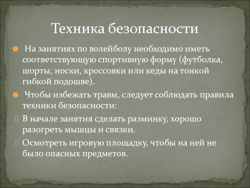 История волейбола. Основные правила игры.Техника безопасности.Основные приемы игры.План презентации: